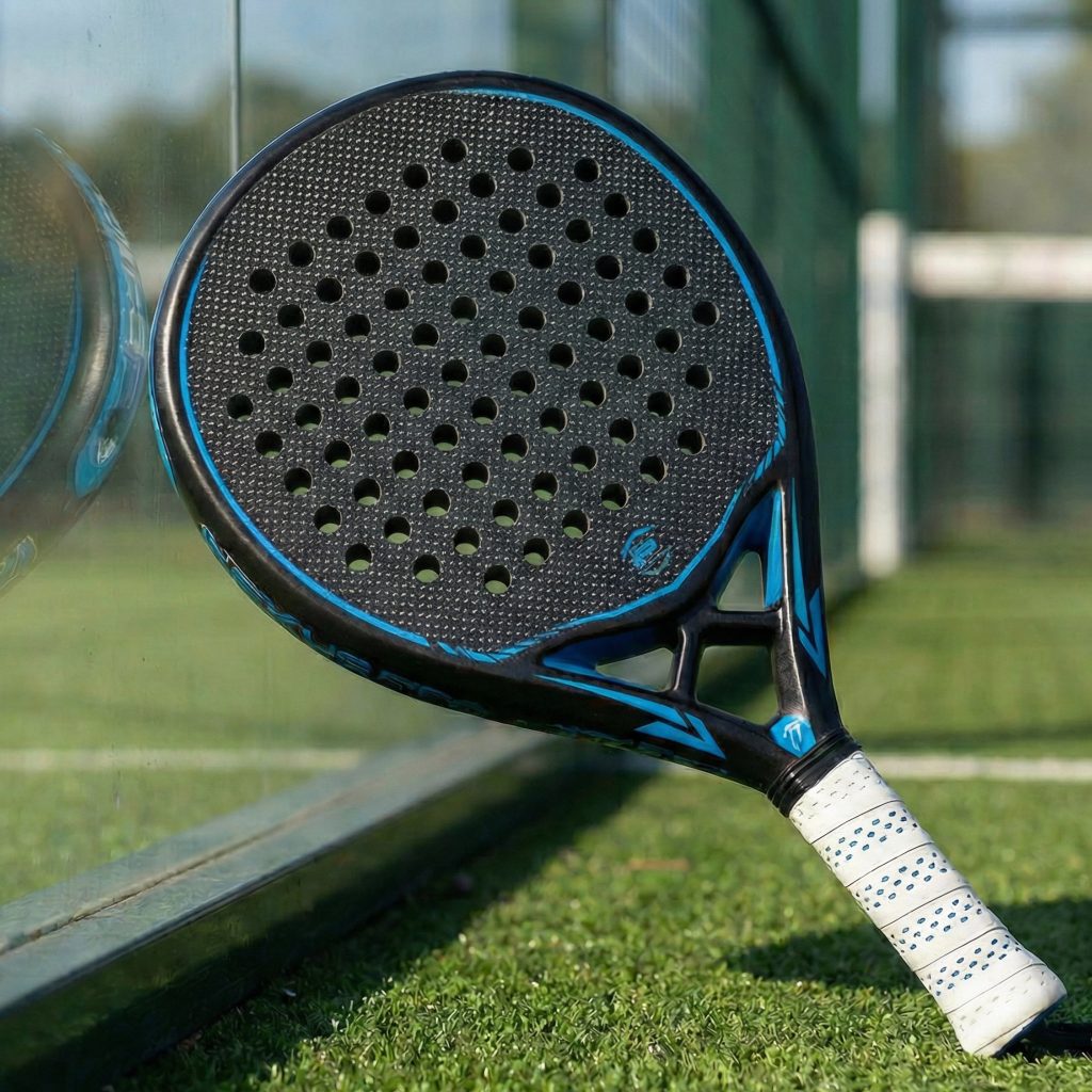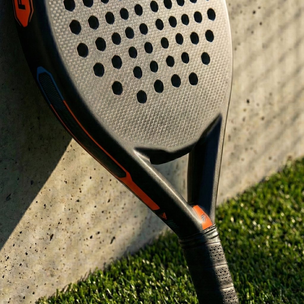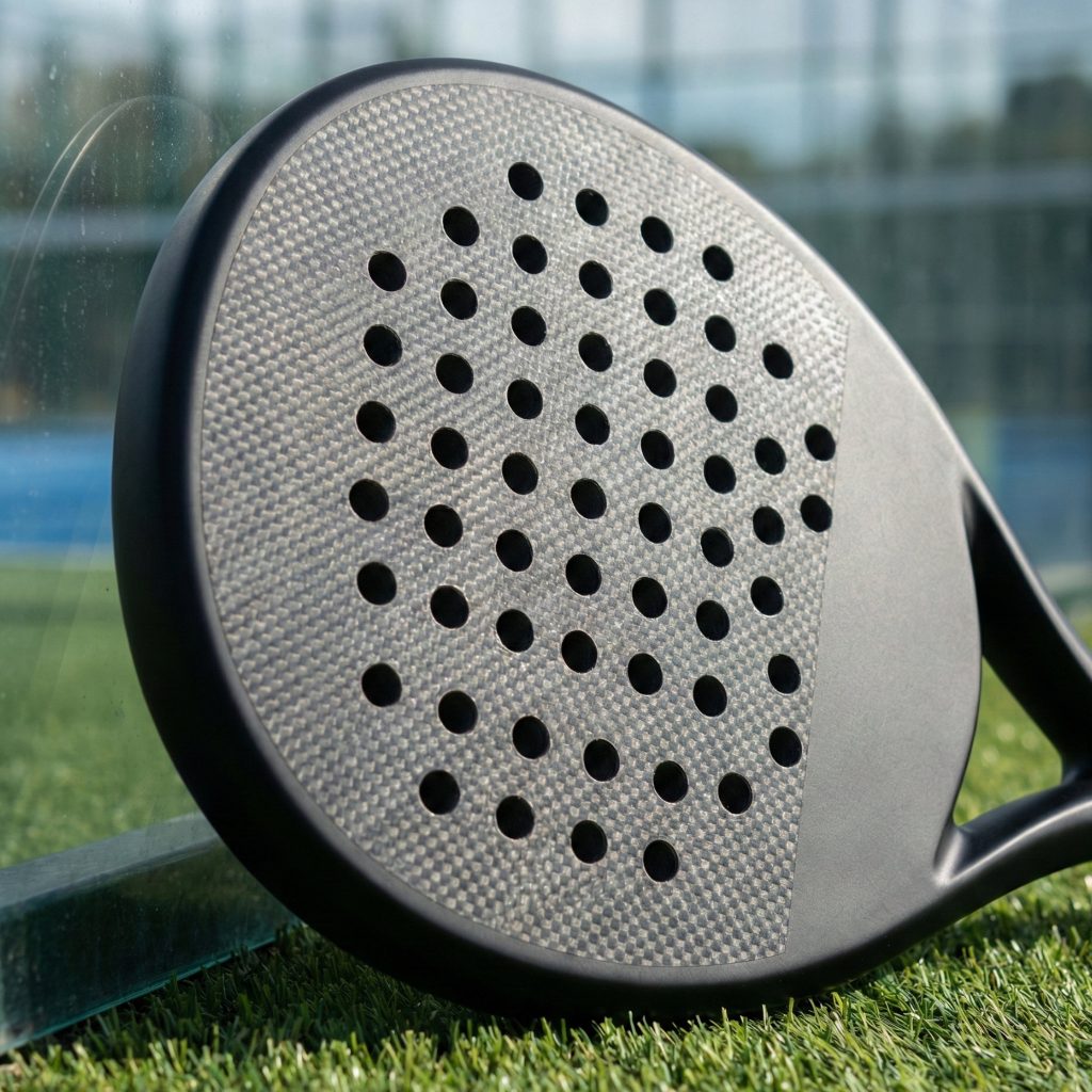 Grabamos patrones geométricos (hexágonos, líneas, logotipos) directamente en la cara del molde. Esto crea una textura permanente en la pala que mejora el efecto sobre la bola sin necesidad de adhesivos extra.